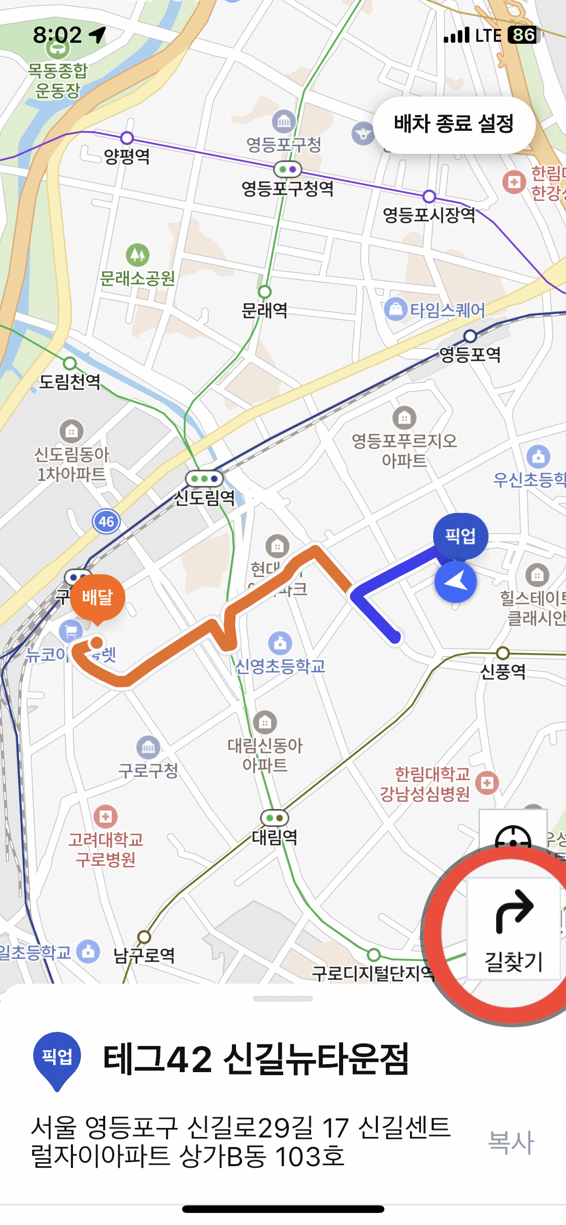 6.콜이 잡히면 "길찾기"를 눌러주세요