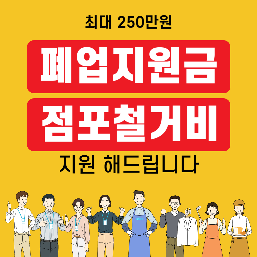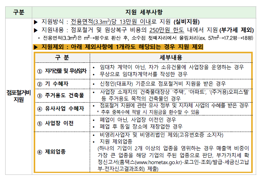 점포철거 및 원상복구에 소요되는 비용 지원(3.3㎡당 13만 원 이내, 최대 250만 원 한도)